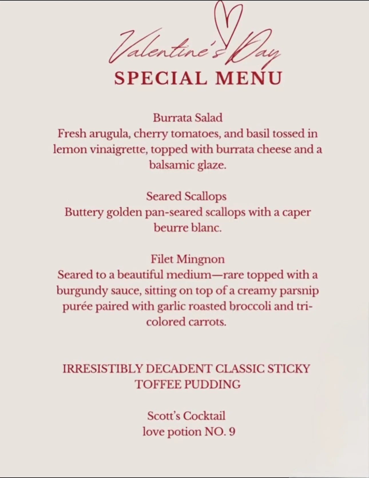 Make your Valentine’s Day reservation now. We will be offering only our Prix Fixe menu featuring Surf & Turf and a Love Potion No. 9 cocktail. Price is $100 per person and spots are filling up fast!
